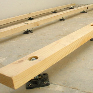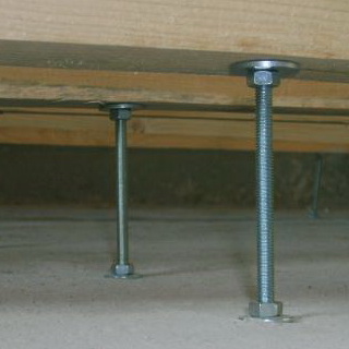 Деревянные покрытия также можно устраивать по регулируемым лагам. Эта конструкция используется в помещениях, где нужно спрятать системы отопления, сантехнические трубы и электропроводку под покрытием пола. Регулируемые лаги бывают деревянными и пластиковыми. Пластиковые используют преимущественно в сырых помещениях. Согласно технологии укладки деревянного пола на лаги, в заранее просверленные отверстия лаг ввинчиваются пластиковые болты-стойки, которые поднимают лаги над полом на требуемый уровень (10-250 мм). Лаги выравнивают специальным ключом.