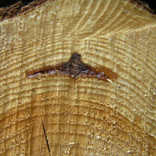 Крень — порок строения древесины, который произошел из-за сжатия зоны ствола и сучьев. Это кажущееся резкое утолщение поздней древесины годичных слоев.
