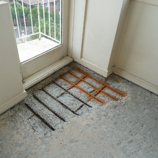 Деревянное основание должно быть не зыбким и ровным, с отклонением не более 2 мм по высоте двух смежных досок. Горизонтальность подстилающего слоя или дощатого настила под ксилолитовое покрытие проверяется двухметровой рейкой во всех направлениях. Просвет между рейкой и основанием должен составлять не более 10 мм. Не рекомендуется выравнивание бетонного слоя с помощью укладки поверх него тонких слоев цементного раствора.