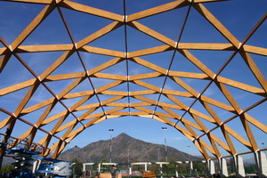 - Такие пространственные деревянные конструкции, как купола, образуемые опиранием в замке трех шарнирных арок и рам, опирающихся непосредственно на фундаменты и стены, выделяются в особую группу. Пространственные по форме конструкции рассчитываются как плоские. В последнее время используют конструкции пространственных покрытий двоякой кривизны с поверхностью гиперболоида, параболоида, гиперболического параболоида, эллипсенда. Создание этих конструкций стало возможным благодаря усовершенствованным способам склеивания древесины.