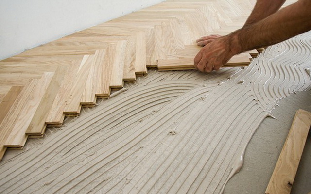 Перед тем как покрыть пол паркетом, на основание наносят слой мастики. По мере укладки планок паркета мастику разравнивают зубчатым шпателям. Толщина слоя мастики не должна превышать 0,6-0,8 мм. Более толстый слой дольше схватывается, а менее тонкий не обеспечивает достаточного сцепления планок с основанием.
