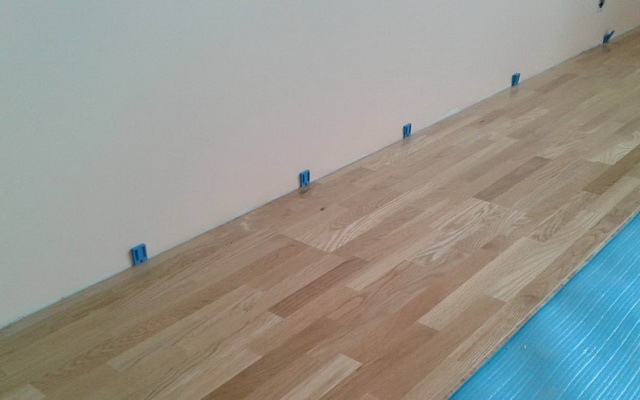 Как правильно уложить паркет, чтобы избежать возможного раздвижения планок при хождении по полу? Для этого в зазоры у стен вставляют клинья в распор с крайними планками паркета. После отверждения мастики, когда планки уложенного паркета плотно приклеились к основанию, клинья вынимают. Зазоры оставляют незаполненными, поскольку древесина с изменением температуры, влажности сжимается или расширяется.
