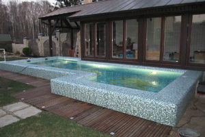 Облицовка бетонного бассейна плиткой или мозаикой — традиционная, но самая дорогая: в 2-2,5 раза дороже, например, полипропиленовых бассейнов.