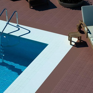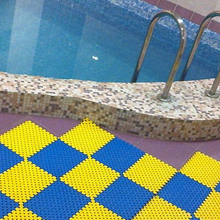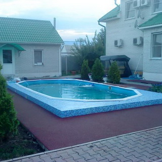 В качестве травмобезопасного покрытия для близлежащей зоны вокруг бассейнов рекомендуется использовать резиновую плитку (например, фирмы EcoStep). Ее можно укладывать не только в зоне отдыха вокруг стационарного бассейна, но и использовать в качестве основы под каркасный разборный бассейн. Данная плитка обладает приятной на ощупь шероховатой упругой поверхностью, снижает нагрузку на суставы ног, а значит, поможет избежать проскальзывания и травмирования. Ее можно использовать круглый год. Этой плитке придают практически любую форму — в зависимости от проекта отделки береговой зоны и зоны отдыха или формы бассейна. Плитка бывает различной толщины и размеров, поэтому всегда можно выбрать подходящий вариант.