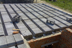 Вместо наката применяют легкобетонные двухпустотные камни — вкладыши высотой 250 мм и длиной 195 мм. Зазоры между камнями и балками тщательно заполняют цементным раствором. Это повышает жесткость перекрытия и придает ему монолитность. Заполнение швов обеспечивает улучшение звукоизоляции.