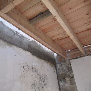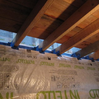 При монтаже деревянных балок перекрытия снизу наката под штукатуркой устраивают пароизоляцию из рулонного материала, которая предохраняет древесину от загнивания при ее увлажнении в холодное время года вследствие проникания водяных паров из верхнего этажа в чердачное перекрытие.