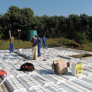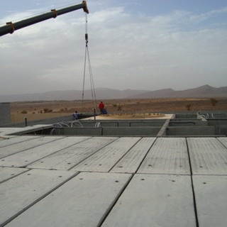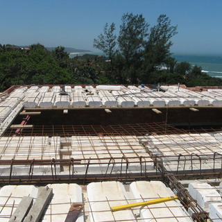Железобетонные перекрытия в виде настилов используются в кирпичных домах. Для устройства перекрытий кирпичных домов применяют настилы высотой 220 мм с круглыми пустотами. Перекрытия в виде настилов состоят из плоскости или ребристых однотипных элементов, укладываемых вплотную и соединяемых друг с другом путем заполнения цементным раствором промежутков между ними. Уложенные вплотную один к другому элементы образуют сплошную конструкцию перекрытия, состоящую из несущей железобетонной части, звуко- и теплоизоляционного слоя и конструкции пола. Для перекрытий в виде настилов не требуется балок, опорами для настилов служат прогоны или стены.