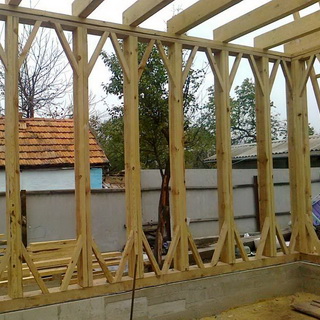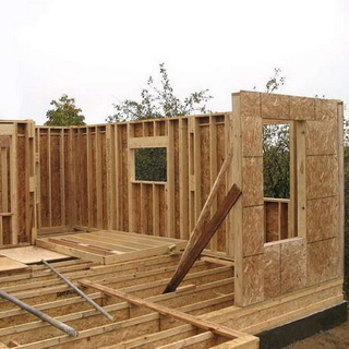 В подобных строениях основой стен является нижняя обвязка из деревянных антисептированных брусьев, укладываемых по цоколю здания и прикрепляемых к нему с помощью анкерных болтов. На обвязку устанавливают стеновые щиты. Сверху стеновые щиты скрепляют укладываемой на них верхней обвязкой, на которую опирается чердачное перекрытие.