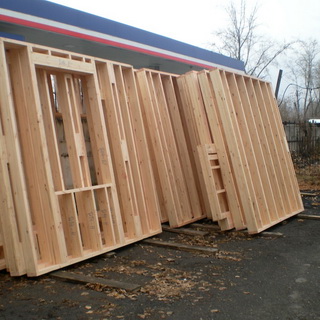 Стеновые щиты изготовляют внутренние и наружные, которые, в свою очередь, подразделяются на глухие, оконные и дверные. Высота щитов равна высоте этажа, ширина принимается равной 600—1200 мм. Щиты состоят из брусчатой обвязки и обшивки, внутренней и наружной, между которой помещен утеплитель.