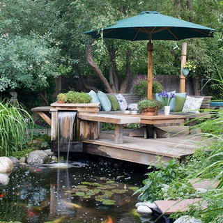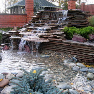 Одна сторона площадки должна обрамляться высокой стеной из камня в форме полуовала с нисходящими ступенями, расположенной ближе к середине площадки, где она окончательно сравняется с уровнем земли. В центральной части этой стенки должен устраиваться каскадный водопад: вода внизу будет падать в небольшую чашу, а далее ручьем поступать в водоем. Это центральная часть ансамбля. По обе стороны от ручья и водоема на площадке, вымощеной плиткой, можно обустроить зону отдыха с лежаками для принятия солнечных ванн или столиком и скамейками для отдыха, детскую площадку или сад с экзотическими растениями в кадках.