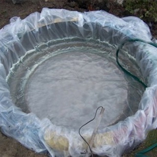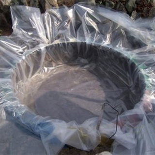 Затем следует цельным полотном полиэтиленовой пленки накрыть всю шину, максимально заполнив пленкой все углубления и оставив по краям еще 60 см этого материала. Внутри покрышки пленку необходимо придавить камнями. То же самое нужно сделать снаружи. После этого необходимо залить воду, чтобы пленка полностью расправилась.