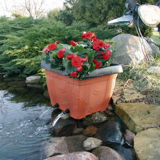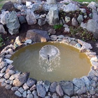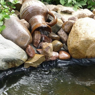 В итоге должен получится маленький гейзер: вода из помпы, расположенной на дне пруда, будет качаться по шлангу, затем выходить наружу и через дренаж фильтроваться, а далее по каскадам стекать обратно в пруд.