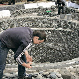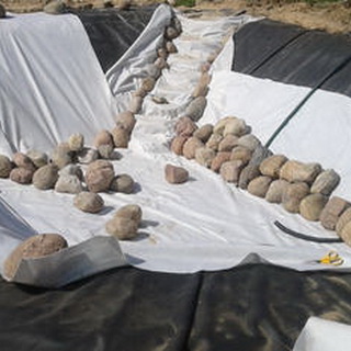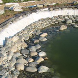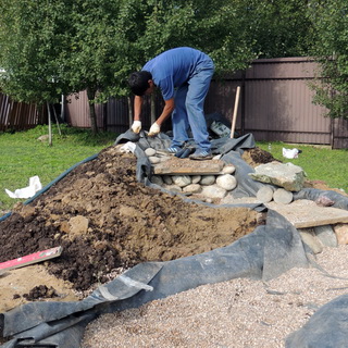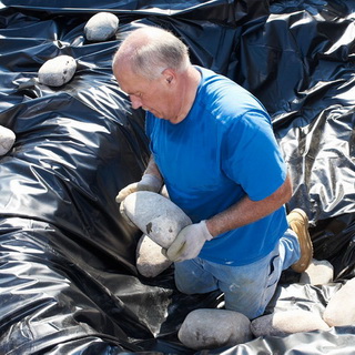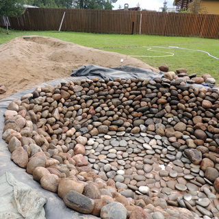 Далее необходимо выстелить ложе для прудика геовойлоком, затем — гидроизоляционным материалом. Декорировать дно и отлогие берега пруда крупным галечником. Если склон пологий (15-25°), то камни закреплять не нужно, а если уклон будет больше, то камни необходимо зафиксировать специальным клеем (типа FIX-ALL).