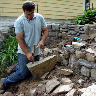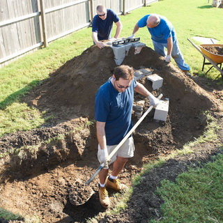 Изначально нужно выбрать место, сделать разметку, расчистить грунт, затем выкопать яму под пруд и неглубокую траншею для ручья. Также нужно выкопать траншею под фундамент вертикальной стенки, от которой будет начинаться склон каскада. После этого необходимо сделать фундамент, засыпав траншею битым кирпичом, осколками керамической плитки, после чего залить все цементным раствором. Как только фундамент затвердеет, можно будет начинать строительство стены. Она в данном случае выполняется из кирпича, а снаружи обкладываться природным камнем. Стена должна выстраиваться в виде полукруга.