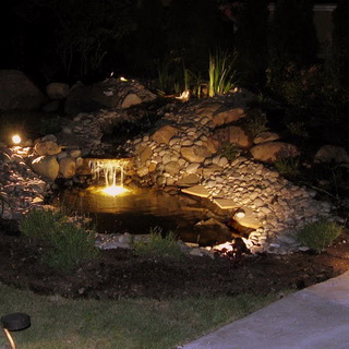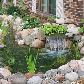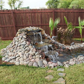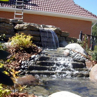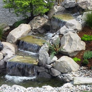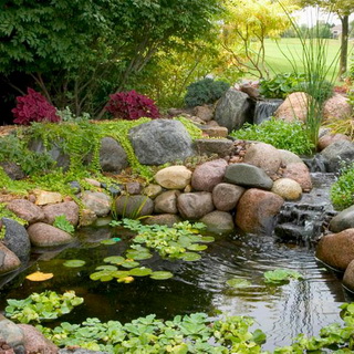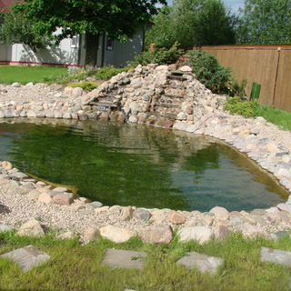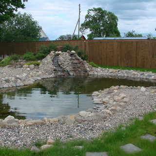 Конечно, можно было бы сделать чашу пруда с водопадом своими руками и значительно меньших размеров, но, учитывая размер всей конструкции и высоту водопада, это сооружение плохо смотрелось бы, в общем. А в большом водоеме вода постоянно будет держаться на уровне. Если для конструкции выбрать насос с хорошими фильтрами, то в водоем можно будет запустить рыбок, которые здесь будут прекрасно чувствовать себя даже зимой, ведь глубокий пруд не промерзнет до дна.