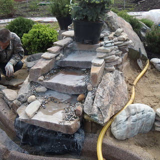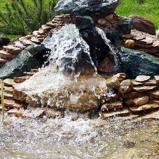 Далее необходимо установить насосное оборудование. Его параметры будут зависеть от размеров каскада и пруда, мощности потока. Поток может быть бурным, средним и слабым. После установки оборудования нужно сделать пробный пуск. Если поток воды огибает камни, необходимо обрезать болгаркой торцы этих камней, тогда вода будет срываться с них, не выходя за пределы искусственного русла.