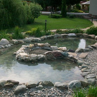 Для этой основательной конструкции потребуется сделать большую чашу из цемента (площадью не менее 10 м2), затем обложить ее камнем.