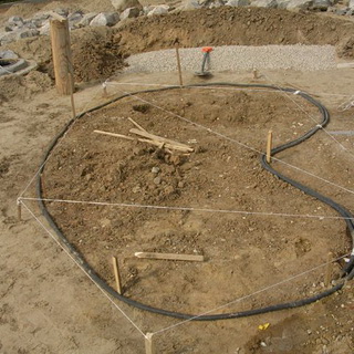 Далее выполняются водопроводные системы. Нужно устроить систему трубопроводов для круговорота воды. Ниша с насосом в стене уже готова, теперь нужно выкопать траншею для труб и установить искусственные водоемы. Один водоем должен располагаться прямо у подножия склона, куда будет поступать водопадная вода, другой — немного подальше. В качестве первого резервуара будет использоваться небольшая пластмассовая бочка, для второго водоема нужно использовать емкость неглубокую, но более широкую, со свободной линией берега. Емкости следует установить в подготовленные под них ямы, соорудив дренажную подушку и гидроизоляцию. Далее нужно сделать извилистую траншею от первого небольшого водоема ко второму. Этот проток также необходимо защитить гидроизоляцией.
