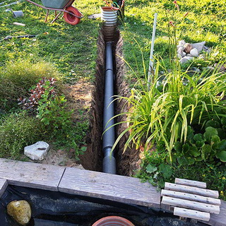 Все трубы водопровода на данном этапе нужно установить и скрыть под землей. Насосная система будет забирать воду из последнего водоема и передавать в верхнюю часть водопада. По пути вода очистится системой фильтрации, будет ниспадать в горки по ступеням в малый водоем, оттуда — переливаться ручьем в большой, собираться в слив к насосу и снова поступать к водопаду.