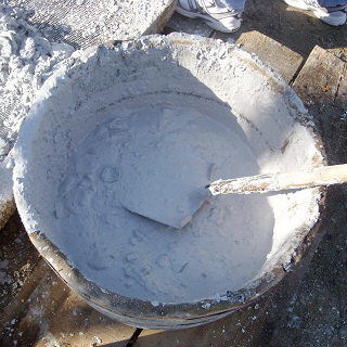 Среднегасящуюся известь необходимо насыпать в творило и до половины высоты ее слоя влить воду. Когда куски начнут рассыпаться, нужно ее тщательно перемешать, влить воду до получения известкового молока и слить в творильную яму.