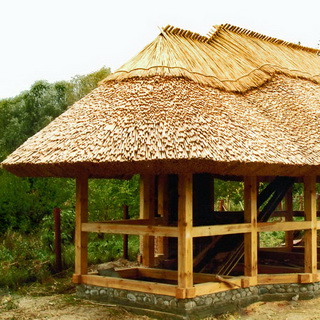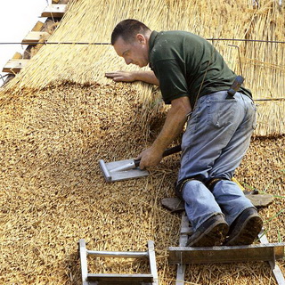 Материал для соломенной кровли производится из камыша и тростника, обработанных особым методом. Слой камыша составляет 30-35 см, при этом 1 м2 готового материала весит 35 кг. Срок службы такой крыши составляет не менее 50 лет. Ее достоинствами являются экологичность, высокие водоотталкивающие, тепло- и звукоизоляционные характеристики. Пожароопасность соломенной кровли не больше, чем у ондулина. Кроме того, в ней не поселяются грызуны.