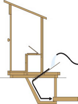 Для улучшения эксплуатационных качеств туалета в конструкции рекомендуется использовать отбойник. Он служит не только устройством для смыва нечистот, но и крышкой сборника, а также вентиляционной отдушиной. Отбойник должен быть съемным, чтобы не препятстовать доступу в сборник. Крепят его под углом 45° с тыльной стороны у основания короба так, чтобы один конец располагался непосредственно под отверстием, а другой — под сливом с кровли с выпуском 40—50 см. Таким образом, в дождливый период вся вода, стекающая с крыши туалета и попадающая на отбойник, станет смывать нечистоты в трубу. Летом на приемную часть отбойника несколько раз в месяц можно направлять струю из шланга во время полива зеленых насаждений.
