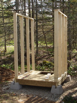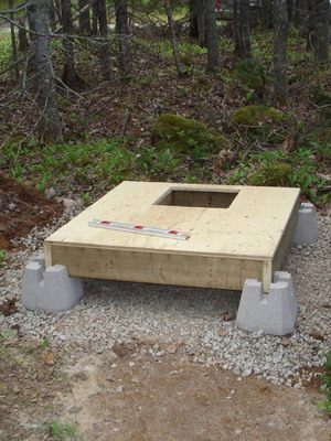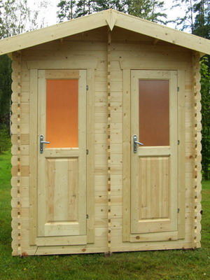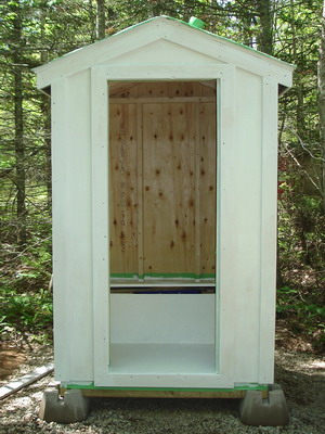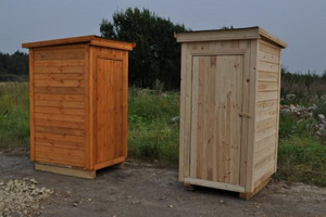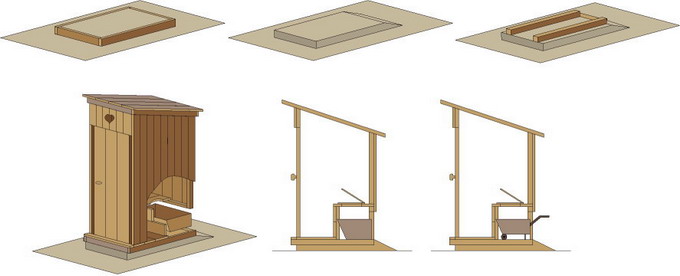 Конструкция пудр-клозета наиболее проста. Основанием ему служит бетонная площадка с пандусом. Снаружи от основания кабинки до уровня полка делают нишу, в которую устанавливают емкость соответствующего размера для сбора нечистот. Для сооружения таклета пудр-клозет своими руками используют брусья не с поперечным, как в предыдущих вариантах, а с продольным расположением. На них закрепляют три пары стоек, причем пара стоек тыльной стенки — с увеличенными размерами до 100×100 мм в сечении. Благодаря этому обшивку тыльной стенки туалета можно производить от уровня потолка до обноски крыши. В остальном конструкция полностью идентична предыдущим.