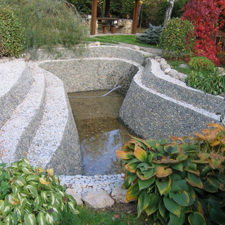 Кроме обычных форм, выпускаются стеклопластиковые ванны для устройства ручьев. Такие емкости имеют имитацию под «каменную» фактуру, поэтому легко вписываются в общий ландшафт. Многоступенчатая форма конструкции позволяет быстро высадить водные растения на необходимом уровне. Русло ручья в данной емкости ограждено по бокам выступами, которые должны предохранять корни растений от вымывания. Все продумано до мелочей, но, конечно, стоимость этих емкостей очень высокая, зато сделать с их помощью пруд с ручейком или водопадом проще простого.