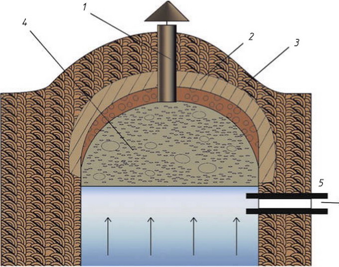 Восходящий ключевой колодец на фото: 1 — вентиляционная труба; 2 — глина; 3 — обсыпка грунтом; 4 — гравий; 5 — водосливная труба.