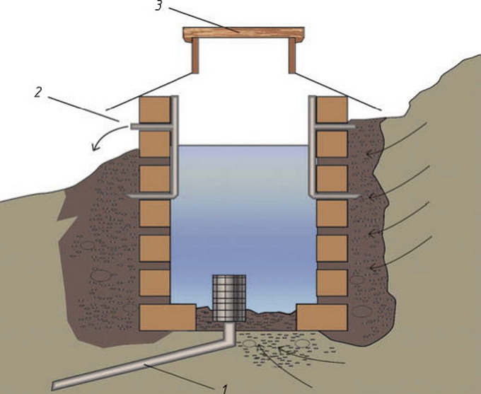 Нисходящий ключевой колодец на фото: 1 — пластиковая труба с фильтром; 2 — переливное отверстие; 3 — люк.